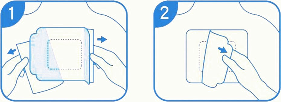 根據創面大小選用相應規格的一次性使用無菌敷貼,可與無菌紗布繃帶組合使用,也可根據需要將固定膠帶剪成相應大小配合使用。開封后及時使用,請勿重復使用。具體使用步驟如下: